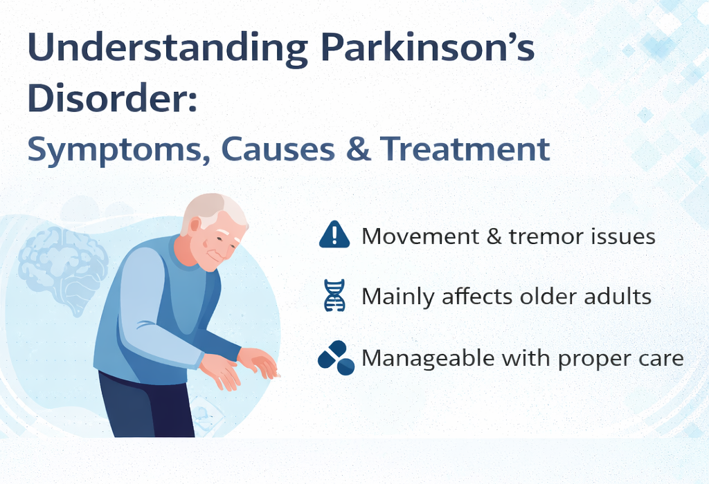 Parkinson’s Disorder is a progressive neurological condition that affects movement, balance, and coordination. It develops gradually and is commonly seen in people above the age of 60, although younger individuals can also be affected.